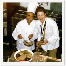stage. "Hey, don't get that beurre blanc sauce on my sax!" |